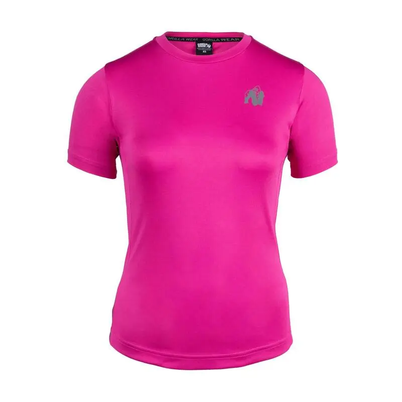 - Camiseta de manga corta Gorilla Wear Raleigh en color rosa, diseñada para ofrecer comodidad y estilo durante tus entrenamientos de musculación.