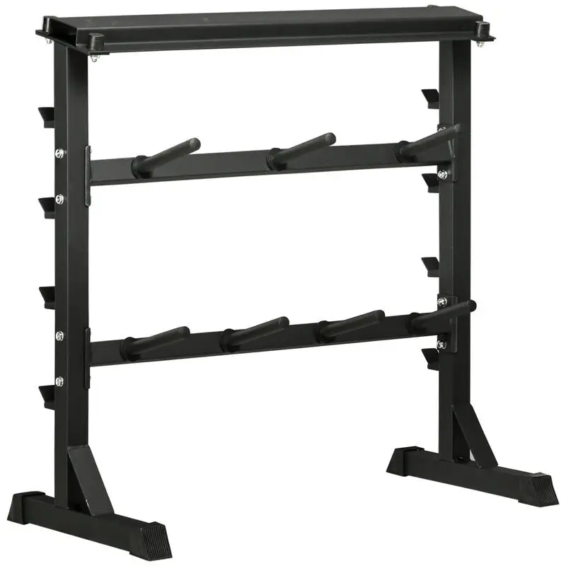 Compra en Decathlon Soporte para barras mancuernas y pesas HOMCOM 100x55x102 cm negro ¿Siempre has querido hacer ejercicios de pesas en casa, pero no sabías dónde guardarlas? Este soporte multifuncional para pesas de HOMCOM es una opción ideal.